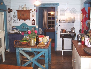 There are four bedrooms, two dining rooms, kitchen, breakfast room, pantry, bathroom, and a flush toilet at the end of the garden path. The house is fully furnished in 1800's style, though the lounge is from the 1930's. Modern conveniences such as tv, video and cd and stereo are concealed in old cupboards.